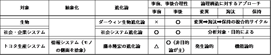 「藤本隆宏の進化論」はトヨタ生産システムそのものを分析したのではなく、それを抽象化した「情報システム」を「進化論的説明」と「機能論的説明」を組み合わせて「進化論アプローチ」として分析したことが特徴のひとつだ、と言えそうです。