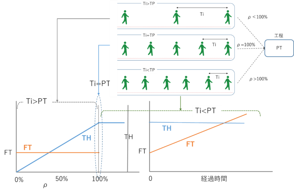 図2に3つの領域の特性を例示します。Ti>PTはPTよりも来客間隔が長い場合です。このときのρは100%未満となります。この領域では、THとFTの基本特性はρに対する変化で捉えることができます。Ti<PTはPTよりも来客間隔が短い場合です。このときのρは100%を超えることになります。この領域では時間とともにWIPqやWTqが変化しますので、THとFTは時間軸(経過時間)に対する変化で捉えなければなりません。生産工程の能力を示すTHやFTは、ρ=100%を境に大きく変化することは、生産ラインの性質を理解する上で、極めて重要であることに留意したいと思います。