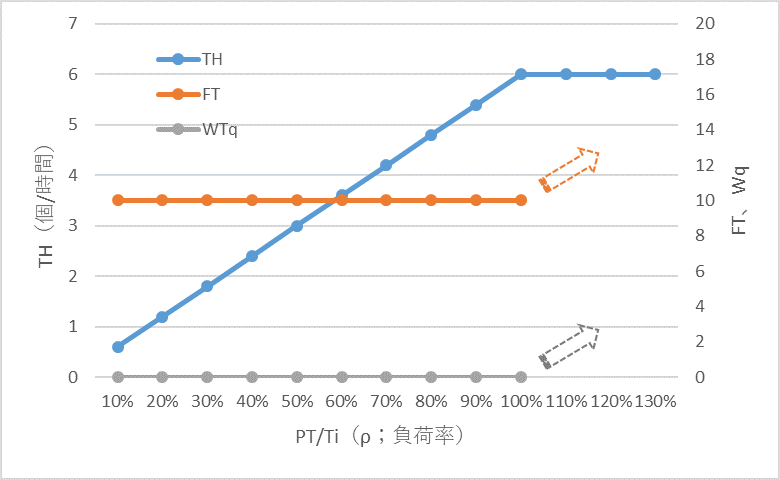 投入間隔;Ti、処理時間;PTが一定の条件では、負荷率;ρ=100(%)を境に、まったく異なる特性を示します。