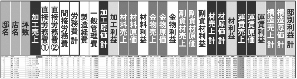 下図は邸別原価表の主な項目を示す。図の下部、邸別原価表の横1行が顧客1邸分のデータである。左端にお施主さまとよばれる最終顧客名を冠した「邸名」、取扱店名、建築される家の坪数などの基本データが示される。そのうえで、前述した3つの売上区分ごとに、売上とそれに対応する原価のデータが列記される。邸別原価表は会計PJの代表的成果物である。