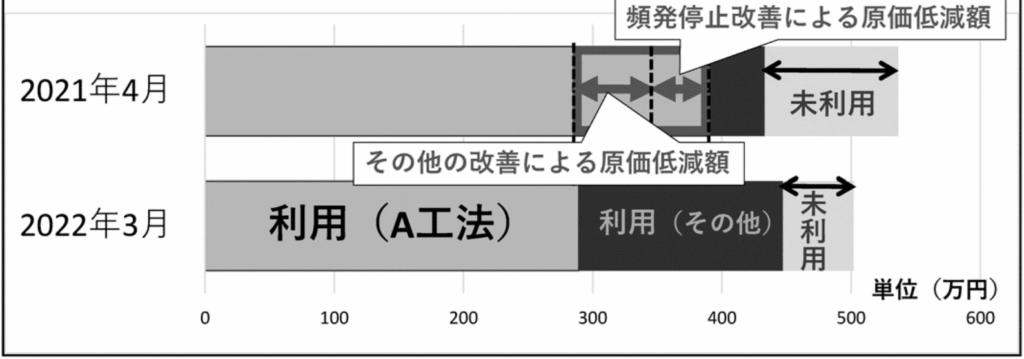 次に,頻発停止改善の改善効果額と直接労務費の実際低減額との差額には、複数の改善効果額が含まれると推定される。GKCにおける休眠生産能力に相当するが、改善によって工数低減されてはじめてそれに気づくことが多い。今回の頻発停止改善もそのひとつである。具体的には、作業の組合せを変える、治具を工夫するなどの改善により工数低減が達成されたことが挙げられる。もちろんさらなる改善の可能性も存在する。