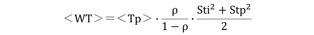 となります。一般的にはTpもTiもバラツキます。Tpの変動係数(標準偏差/平均)をStp、TiのそれをStiとすると、待ち時間;WT(平均は<WT>)の近似式は次のようになります。