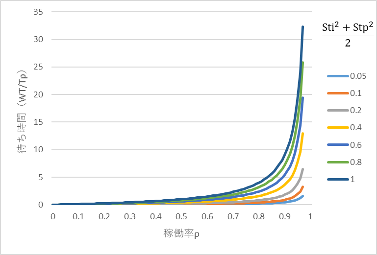 ρ/(1-ρ)は稼働率依存、(Sti2+Stp2)/2は変動係数依存で一般的には0~1の値をとります。(Sti2+Stp2)/2が0.05~1のときのWT/Tpの一例を図2に示します。