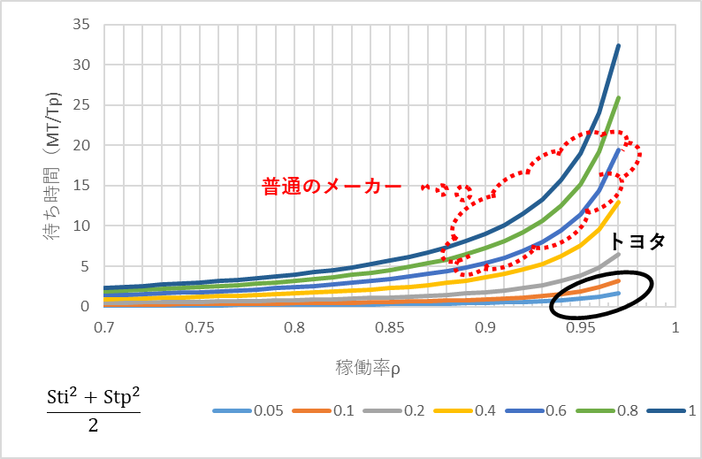 普通のメーカーの正味付加価値時間に対する生産リードタイムがトヨタの10倍だ、という話とほぼ合います。トヨタがなぜ待ち時間が短いのか、待ち時間の近似式をみれば一目瞭然です。 (Sti2+Stp2)/2 が小さい、つまり、StiおよびStpが小さいからです。