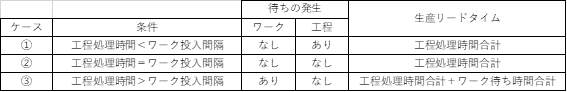 ならどうなるでしょうか。生産リードタイムは?、と聞かれても具体的な時間値がわからないと答えられませんね。最初の投入工程(第1工程)で2番目以降のワークに待ちが発生します。第2工程以降ではワークの待ちは発生しません。立ち上がり時期を除いて、工程が待つ時間も発生しません。まとめますと表1のようになります。