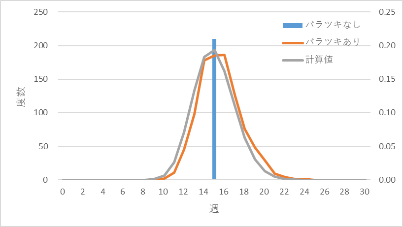 シミュレーション結果と計算で得られた平均15、分散4.23の分布(ここではガンマ分布を使います)を重ねると図3のようになり、計算値とシミュレーション値がほぼ一致することが判ります。