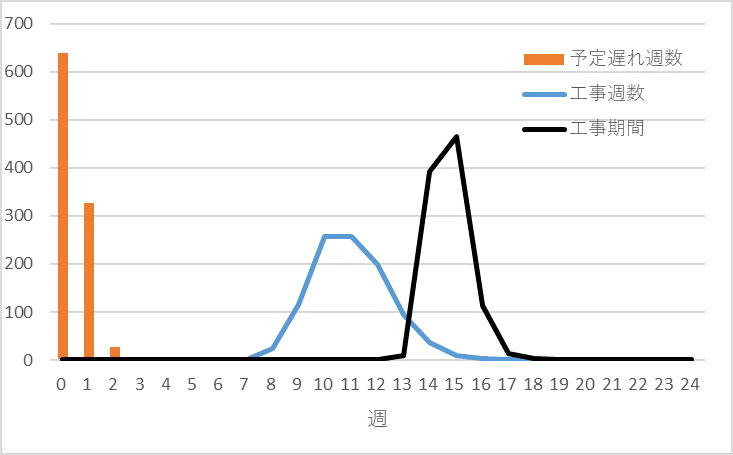 図8の水色が前の工事が終わったら直ちに次の工事を始める場合の工事期間(リードタイム)の分布、橙色が予定以内(横軸;0)と予定より遅れる(横軸;1以上)確率の分布、黒色がリードタイムの分布です。
