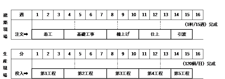 建築現場では、家屋(つくるモノ)が固定されていて、リソースが流動するが、生産現場では、リソースが固定されていて、製品(つくるモノ)が流動する、と解釈できます。