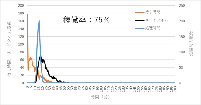 図4 稼働率75%での処理時間、待ち時間、リードタイムの分布