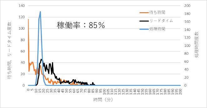 図5 稼働率85%での処理時間、待ち時間、リードタイムの分布