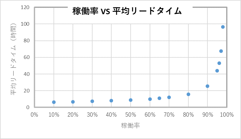 稼働率が高くなると生産リードタイムが急激に長くなる。逆にみますと、稼働率を低くすると(人、設備を過剰にすると)生産リードタイムが急激に短くなる。
