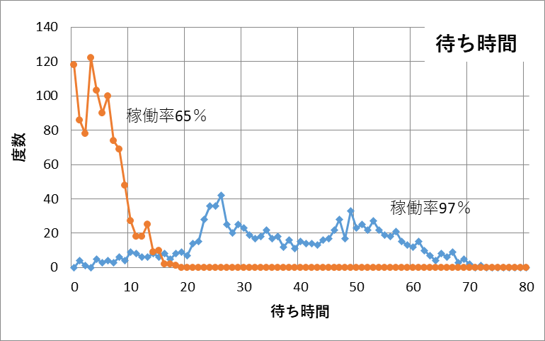 図2 稼働率97%、65%での待ち時間