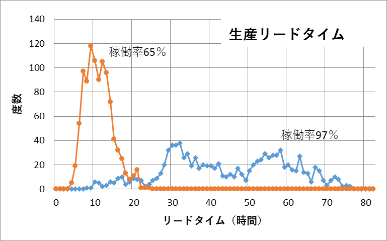 図1に稼働率が97%のときと、65%のときの生産リードタイムの分布を示します。