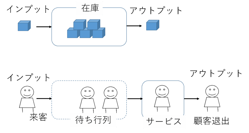 在庫問題では、インプットが材料投入、アウトプットが材料消費、その間に在庫が溜まるが、待ち行列問題ではインプットが顧客の到着、アウトプットがサービスの完了(顧客の退出)であり、その間に行列ができる。