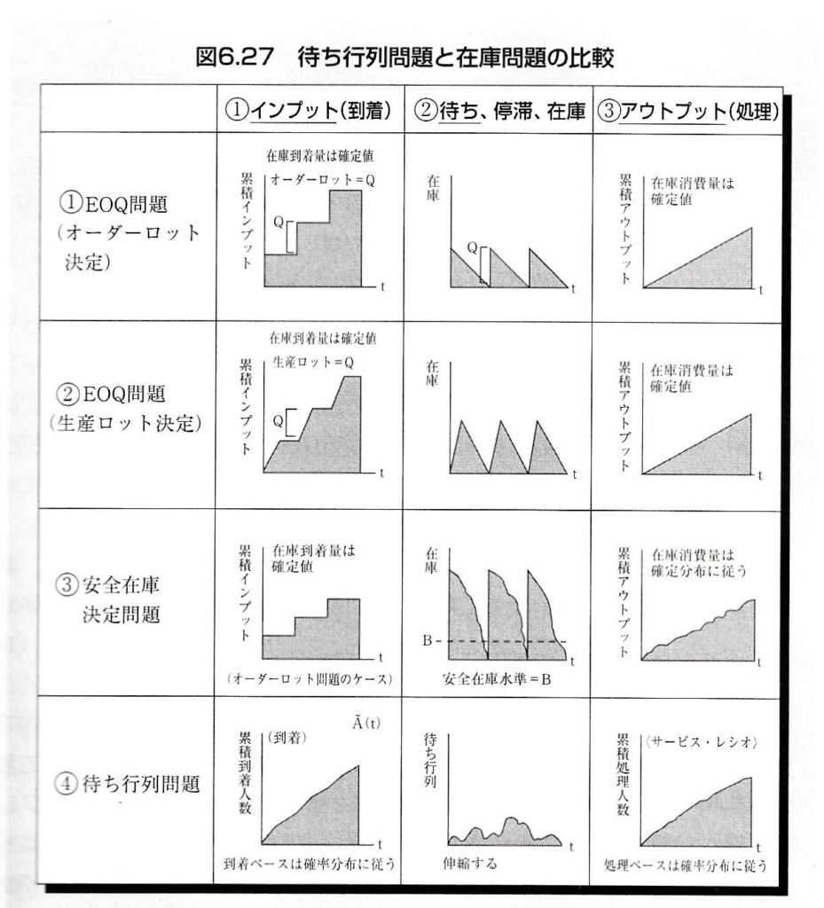 図6.27と説明を対比してみますと、EOQ問題は、インプットはオーダーロットで決定、アウトプットは生産ロットで決定されているので不確実性はなし。図では在庫の増減は直線で表している。安全在庫問題ではインプットは決定論モデルなので在庫の山の高さは一定であるが、アウトプットはある程度不確定なので、在庫減少が非線形(曲線)で表している。待ち行列問題はインプットもアウトプットも不確実なので在庫の増減が非線形で表していると、解釈できます。